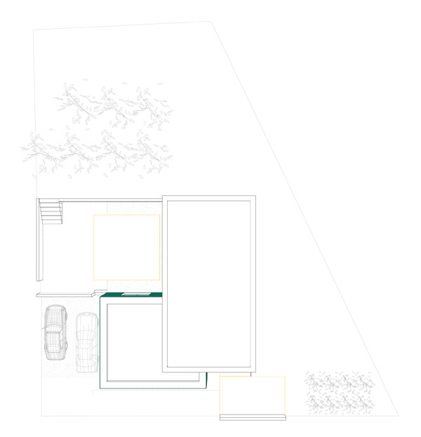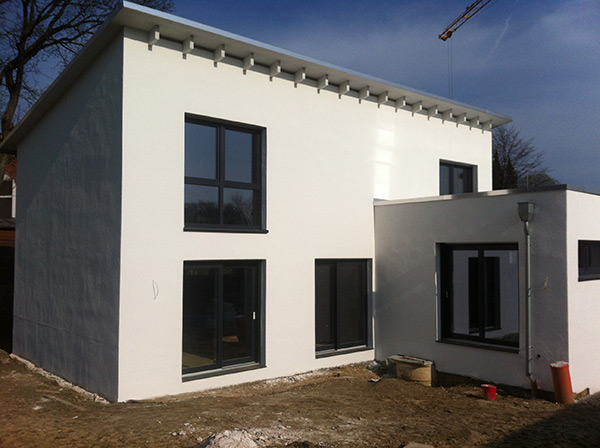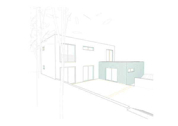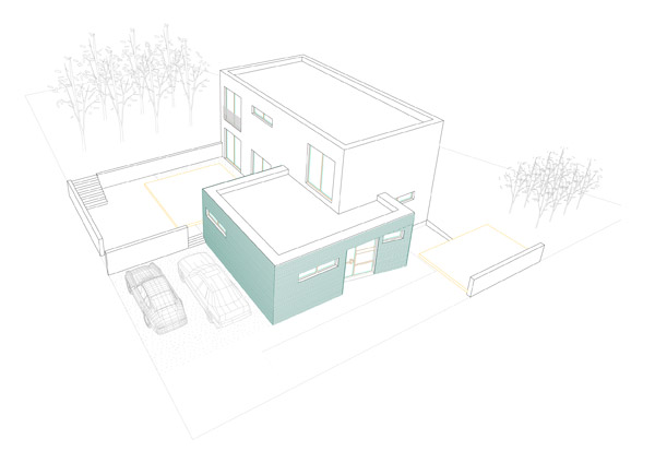 Eine junge Familie plant auf dem Grundstück einer Neubausiedlung ein teilunterkellertes Einfamilienhaus. Die Anordnung der Gebäudekörper trägt der bereits vorhandenen Bebauung Rechnung.