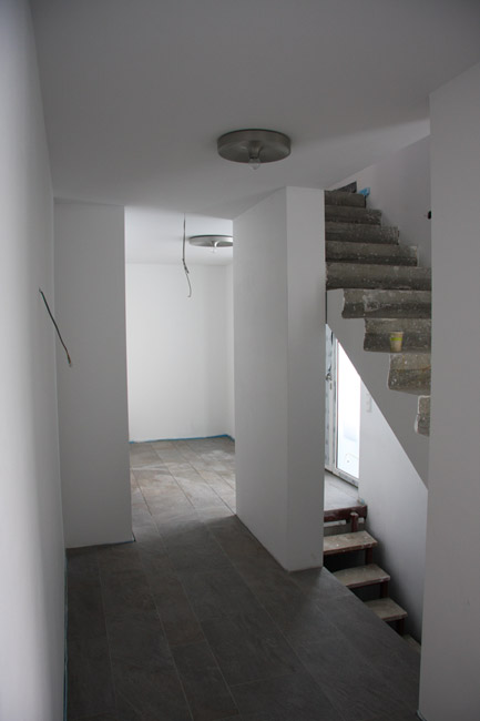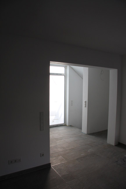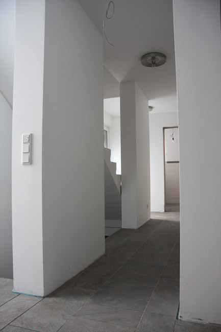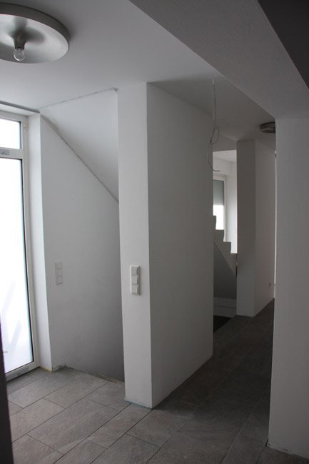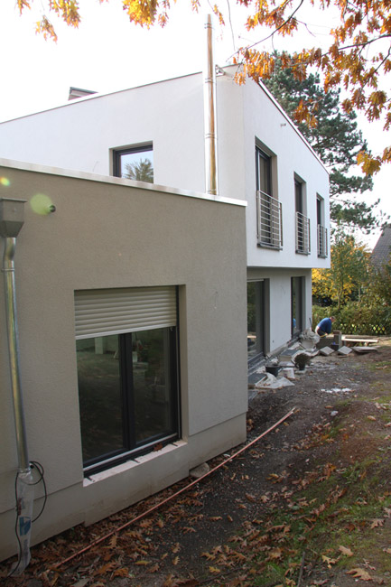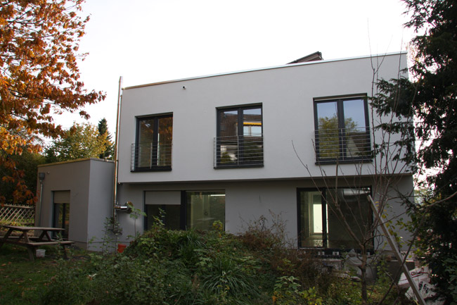 Auf dem Gartengrundstück eines Zweifamilienhauses wird ein Einfamilienhaus für die junge Familie des Eigentümers errichtet. Der Nord-West-Lage des Gartens wurde durch größtmögliche Transparenz der Fassade Rechnung getragen.